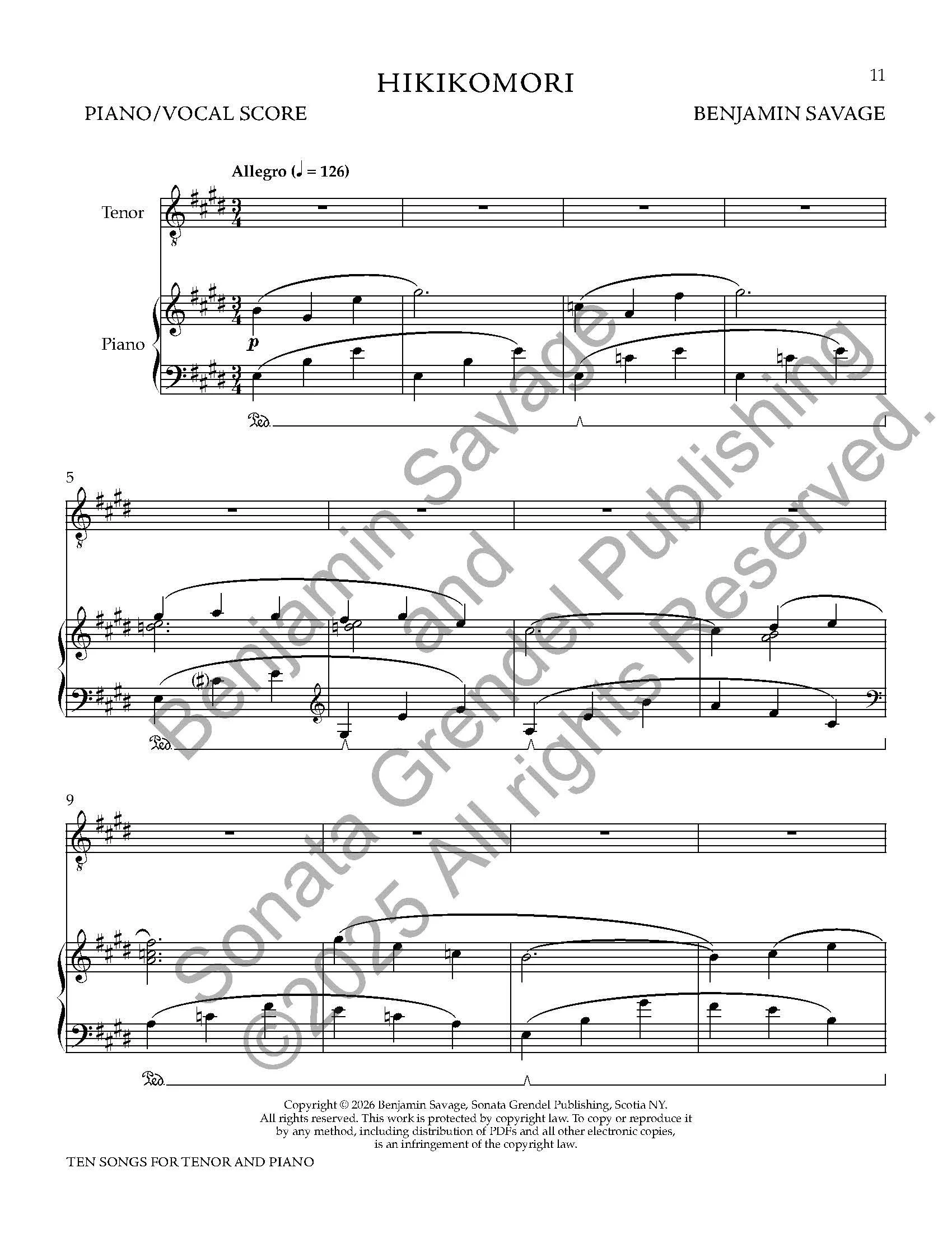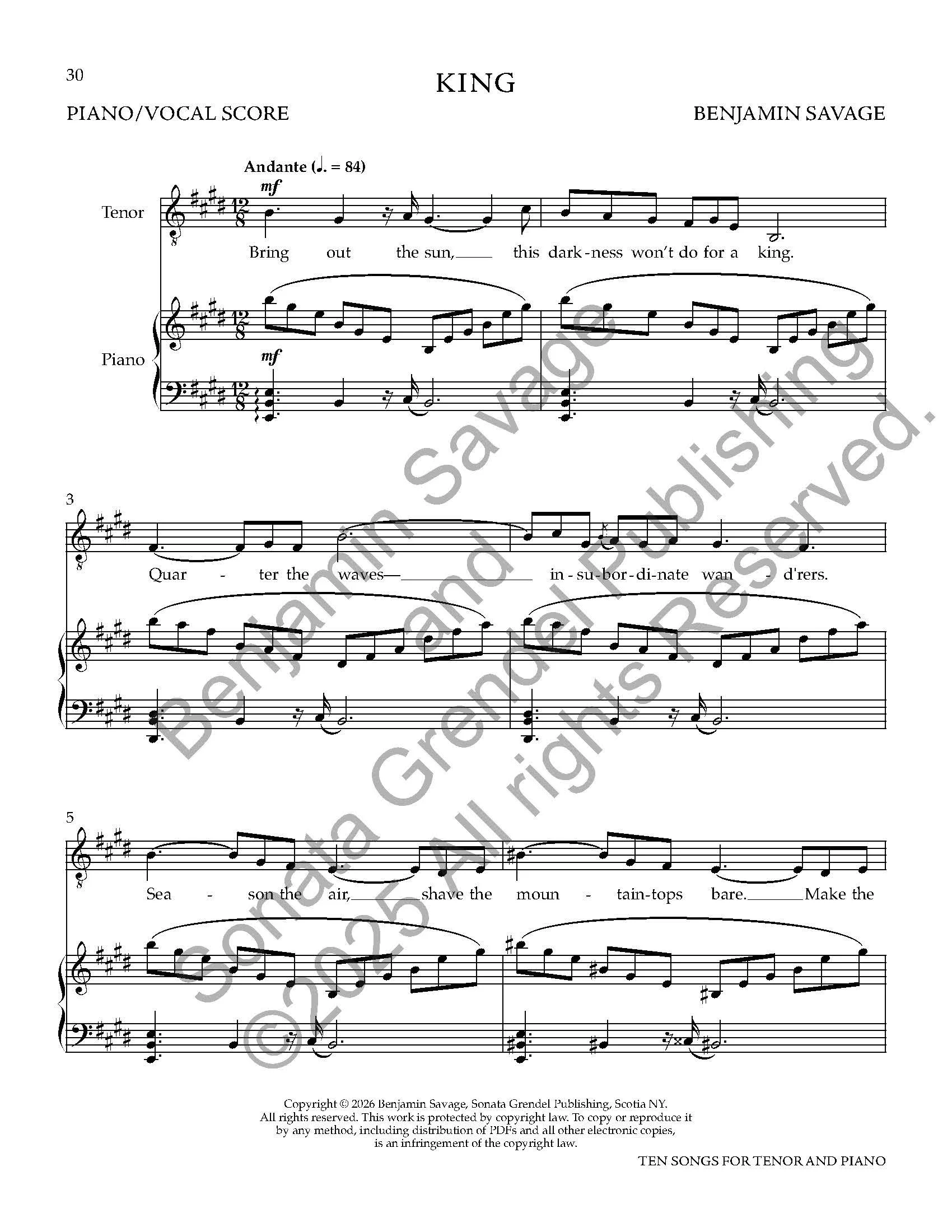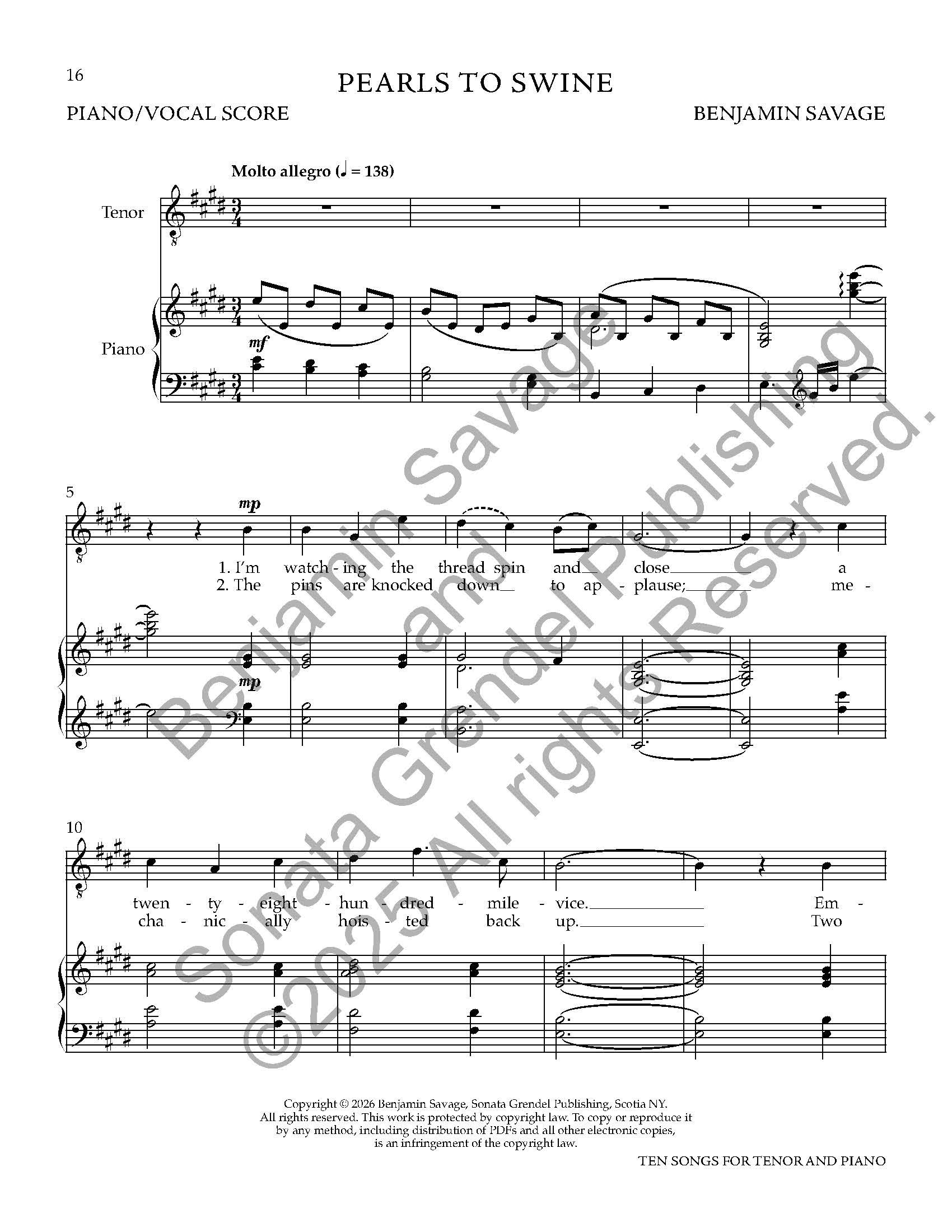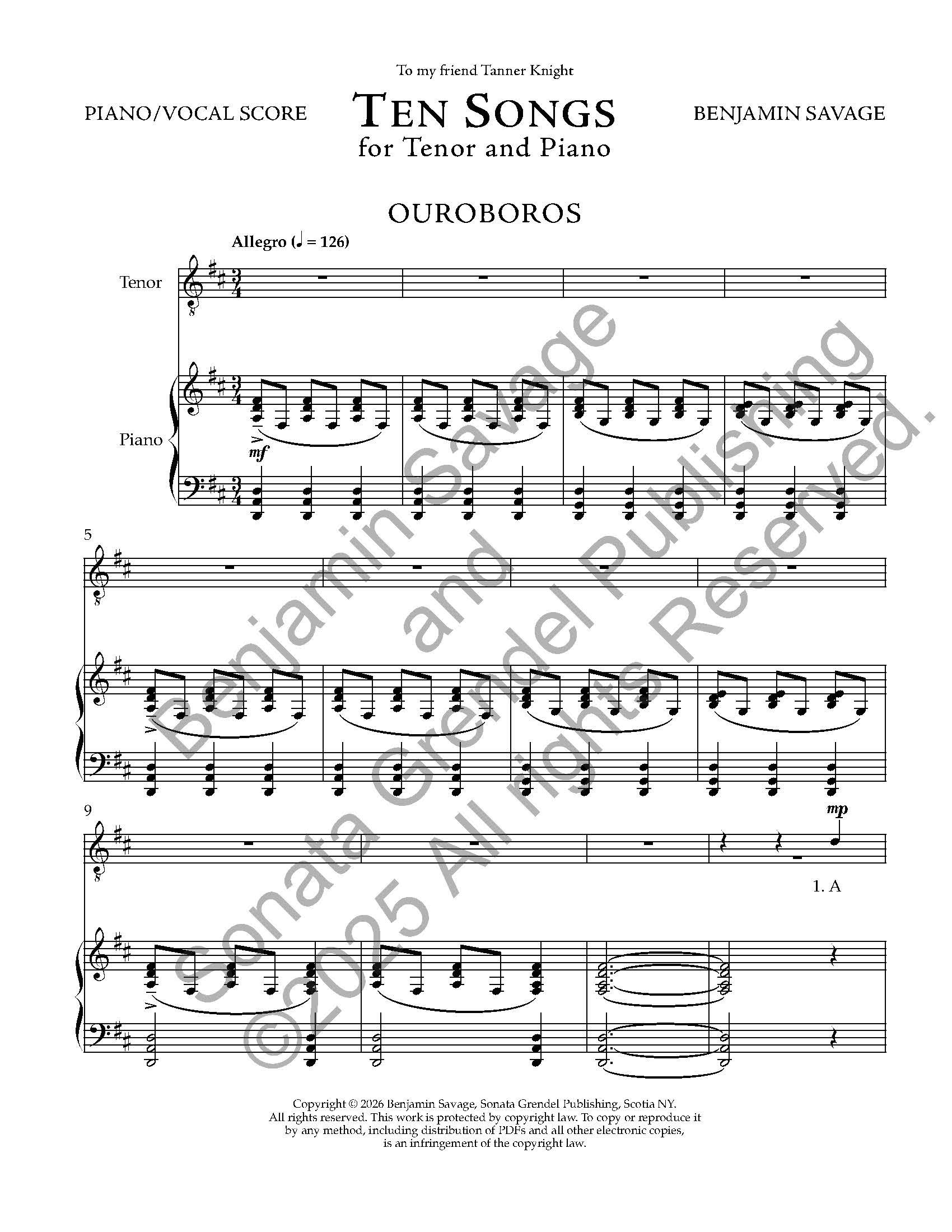 Ten Songs for Tenor and Piano is a collection that pairs primarily contemporary texts with harmonies rooted in the Classical and Romantic traditions. My intention was to offer listeners a varied emotional soundscape—at times by deliberately creating tension between melody and text through contrasting moods and styles. While the ten songs do not share a single overarching theme, performers and listeners alike may notice threads of environmental interest, hyper-consumerism, and animal advocacy in Chaff, Pearls to Swine, Ouroboros, and King; a portrait of isolation in Hikikomori; reflections on love, life, and death in Bowline, An Ocean, and Night; and even a whimsical, bel canto-inspired setting of Italian text in The King Who Rode to Town. I hope both performers and listeners will find moments within these songs that resonate with them.