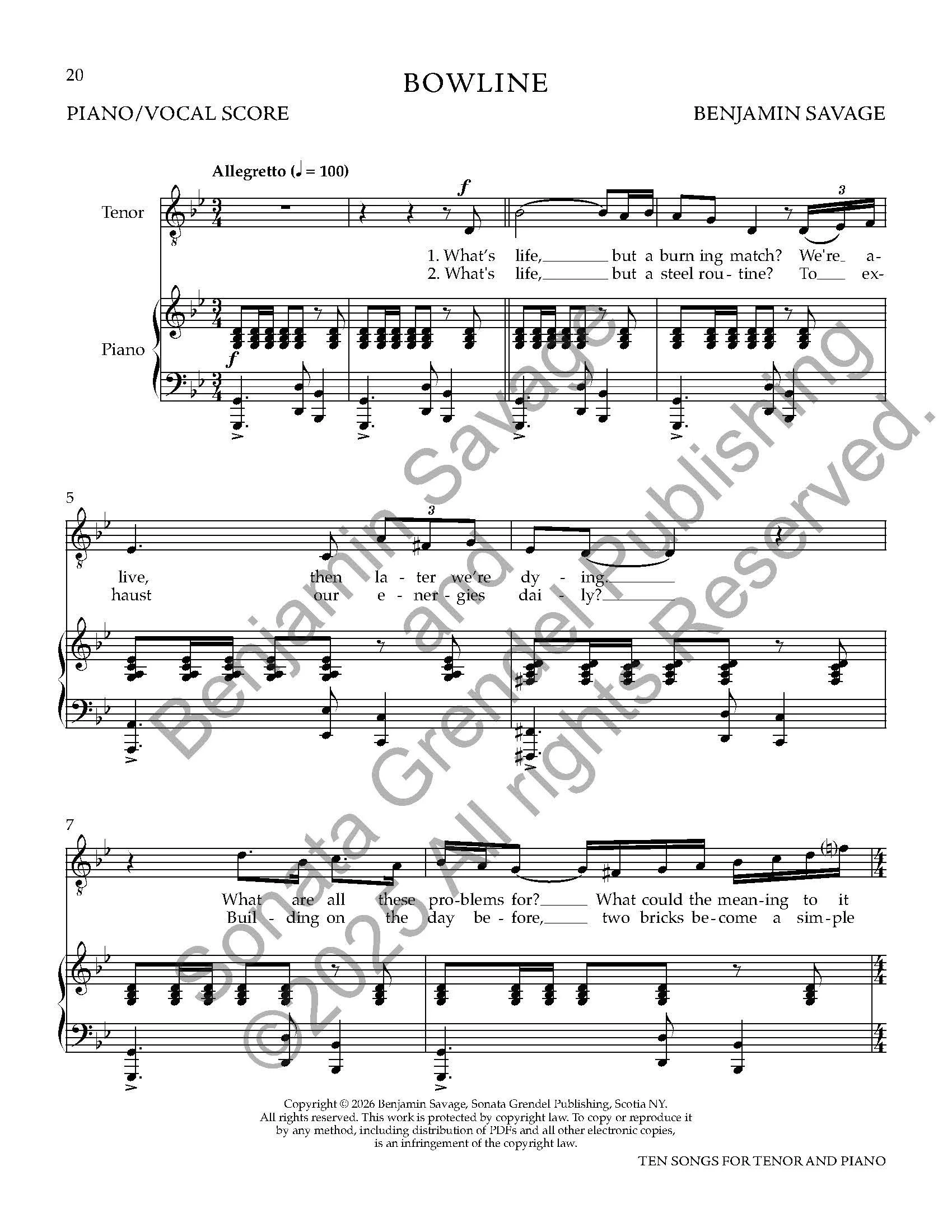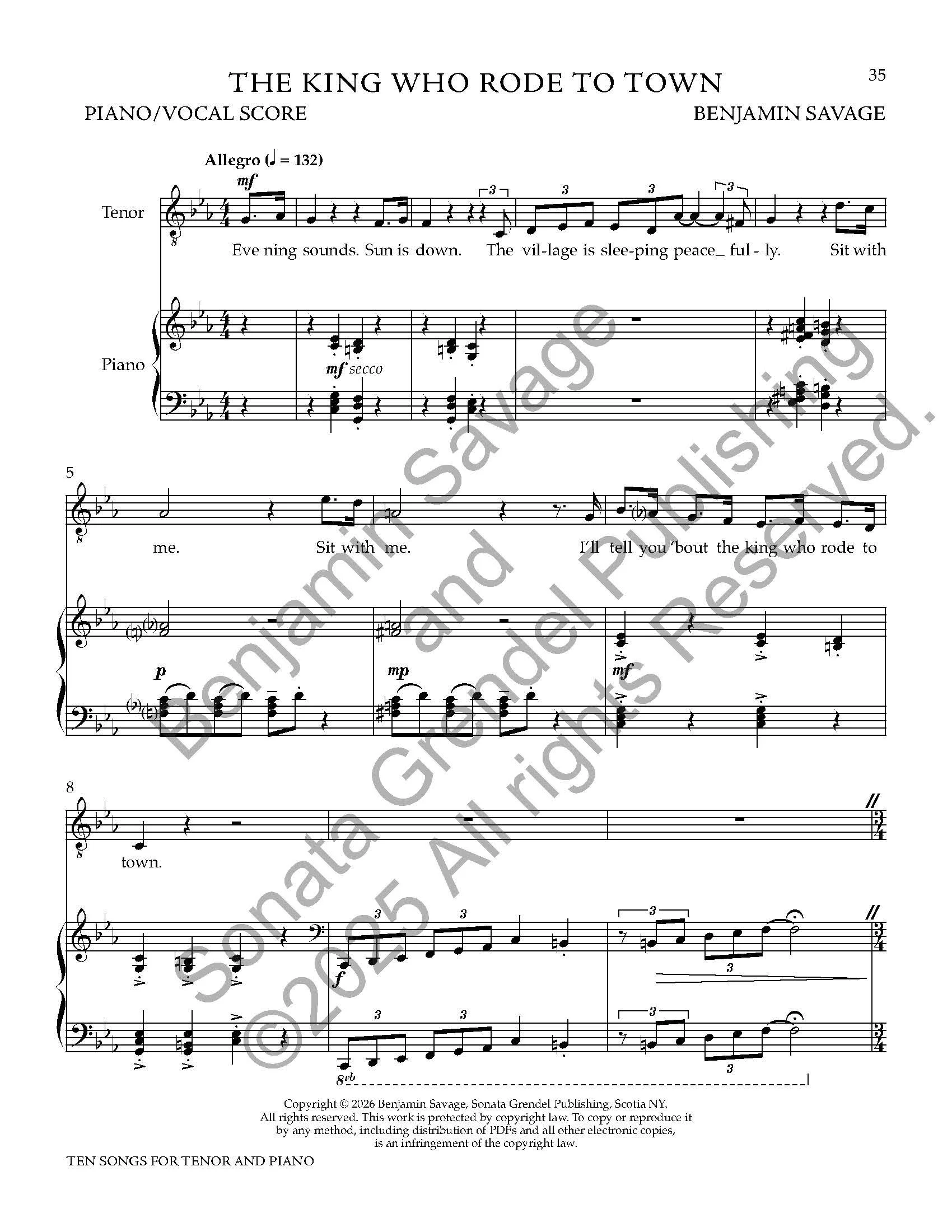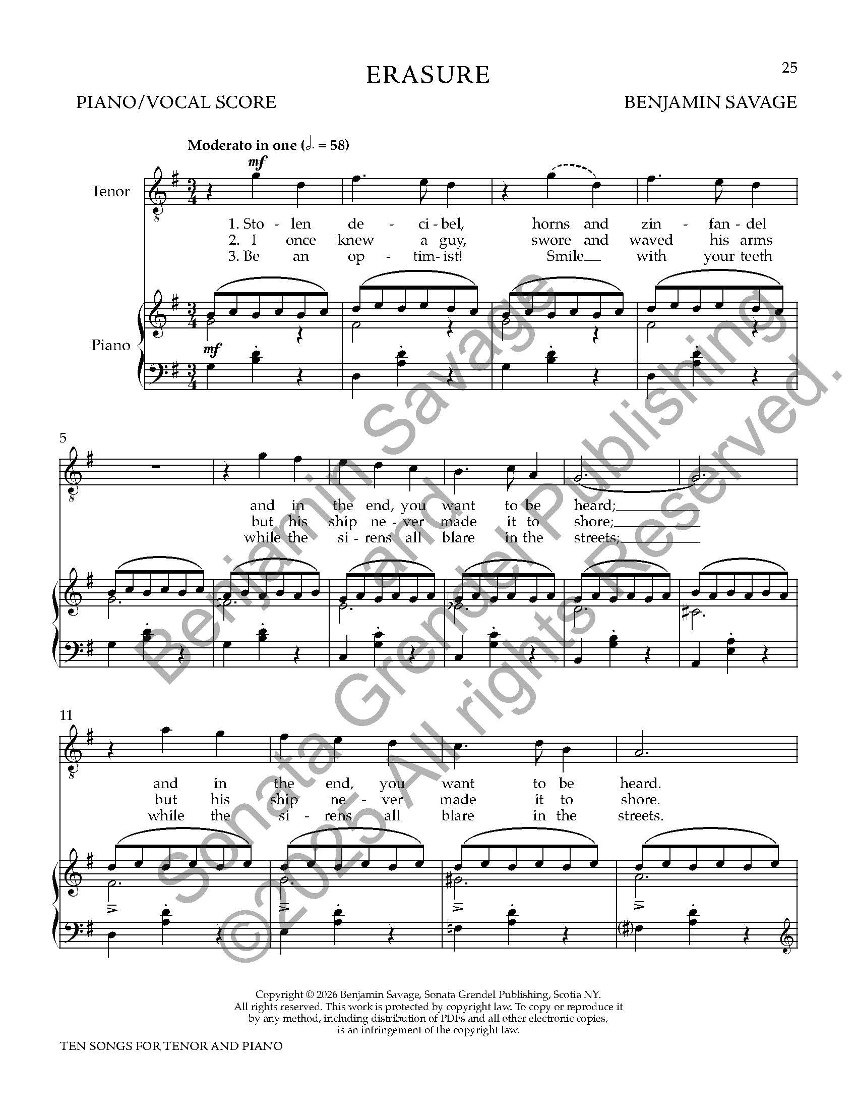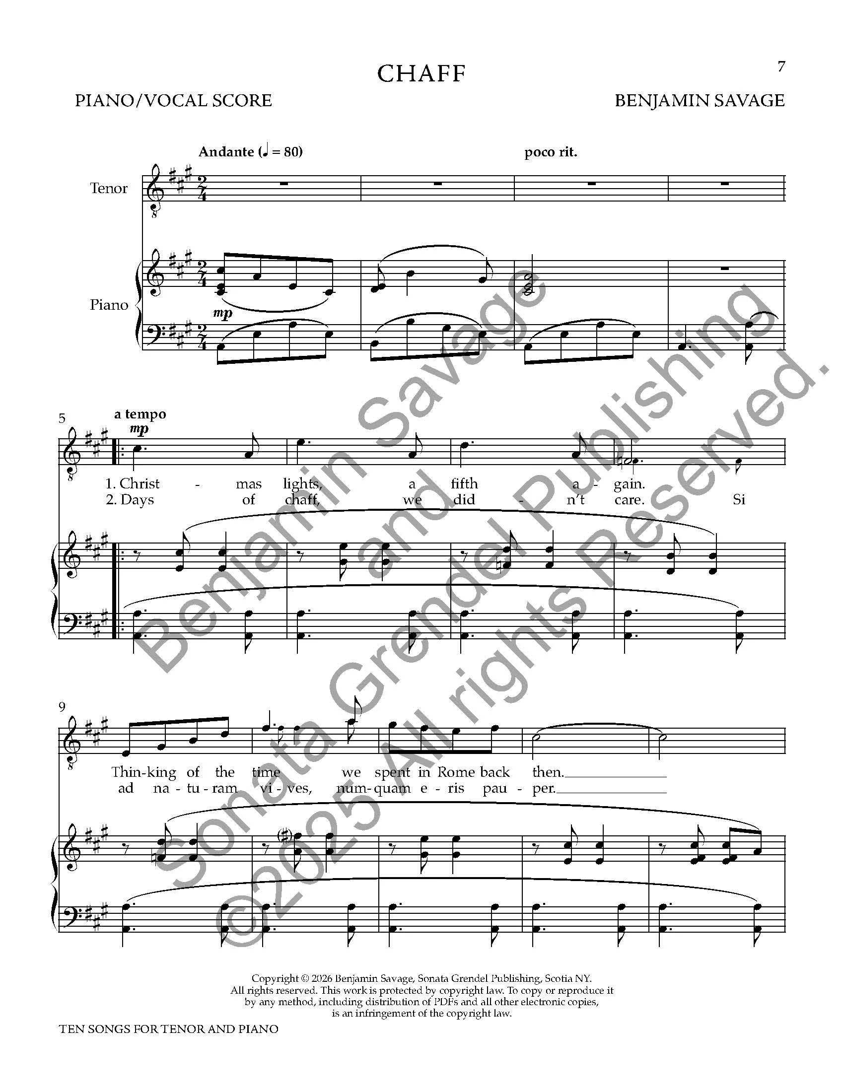 Ten Songs for Tenor and Piano is a collection that pairs primarily contemporary texts with harmonies rooted in the Classical and Romantic traditions. My intention was to offer listeners a varied emotional soundscape—at times by deliberately creating tension between melody and text through contrasting moods and styles. While the ten songs do not share a single overarching theme, performers and listeners alike may notice threads of environmental interest, hyper-consumerism, and animal advocacy in Chaff, Pearls to Swine, Ouroboros, and King; a portrait of isolation in Hikikomori; reflections on love, life, and death in Bowline, An Ocean, and Night; and even a whimsical, bel canto-inspired setting of Italian text in The King Who Rode to Town. I hope both performers and listeners will find moments within these songs that resonate with them.